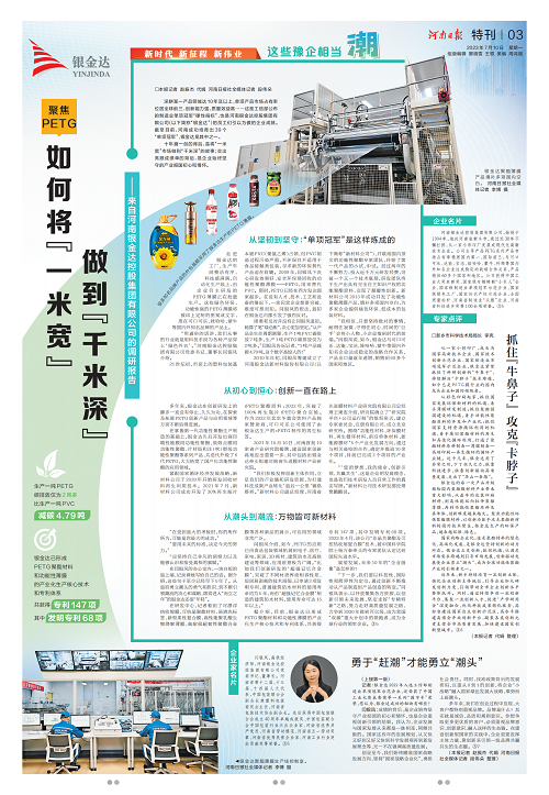 7月10日,《河南日報》聯合《大河財立方》刊發銀金達董事長閆銀鳳專題訪談《這些豫企相當潮丨河南銀金達控股集團有限公司:如何將“一米寬”做到“千米深”》,聚焦銀金達創新驅動潮流涌動的發展態勢,新鄉市科學技術局李亮局長對銀金達的創新驅動高質量發展之路給予高度評價。全文如下: