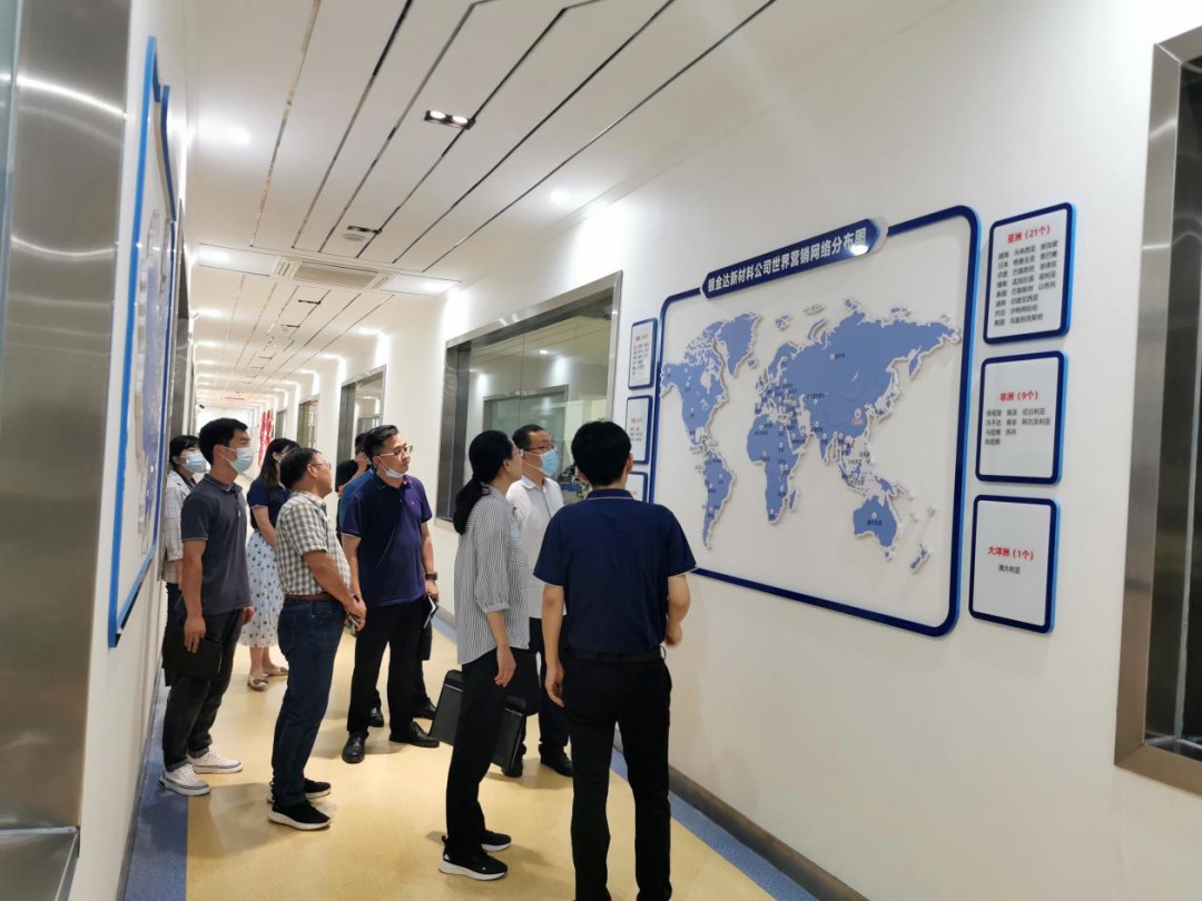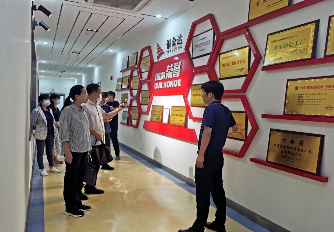 2022年8月11日,新鄉市科技局副局長郝科偉、新鄉市科技局黨組成員、市紀委監委派駐市科技局紀檢監察組組長李超平等一行,到河南達新源新材料有限公司開展惠企利企政策落實情況專項調研。衛輝市科工信局副局長彭文林、科長張衛華等相關領導陪同調研,銀金達集團創新協同中心主任周宏濤、新材料公司副總經理、技術總監張啟綱等陪同匯報工作。